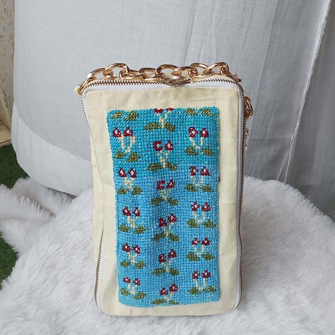 Meet Chainloom, the artisanal sling bag where tradition meets modern chic. With a soft cream canvas base, bold golden chain strap, and a hand-embroidered blue patch of dainty red florals, Chainloom is the perfect balance of elegance and artistry.